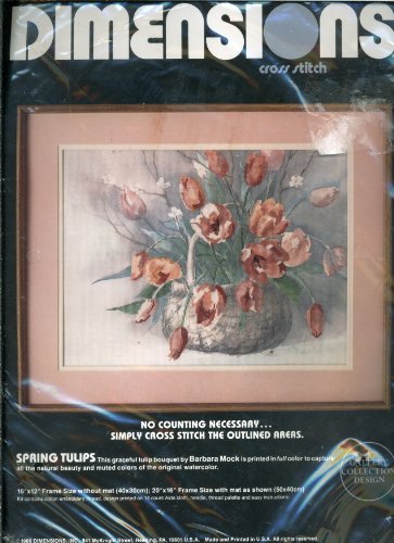 Vintage 1986 Dimensions Cross Stitch Kit No Count - Spring Tulips Designed by Barbara Mock is Printed in full color to capture all the natural beauty and muted colors of the original watercolor of this graceful Tulip bouquet.
