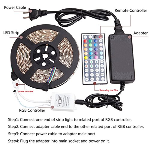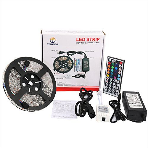 WenTop Led Strip Lights Kit DC12V Power Supply Waterproof SMD 5050 16.4 Ft (5M) 300leds RGB 60leds/m with 44key Ir Remote Controller for Kicthen Bedroom Sitting Room and Outdoor
