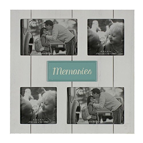 -. Feature : Rustic white wooden collage picture frame from Haysom Interiors. / An ideal home accessory gift to suit any home. / Complete with a duck egg blue wooden plaque in the middle which reads "Memories". / Holds two 4" x 4" and two 4" x 6" photographs, overall measurements are 12" x 12" x 0.5". / This is a wall hanging frame only.
