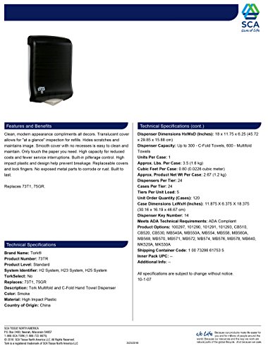 Tork 73TR Multifold and C-Fold Hand Towel Dispenser, Plastic, 18" Height x 11.75" Width x 6.25" Depth, Smoke (Case of 1 Dispenser) For use with Tork CB530, MB550A and MK520A
