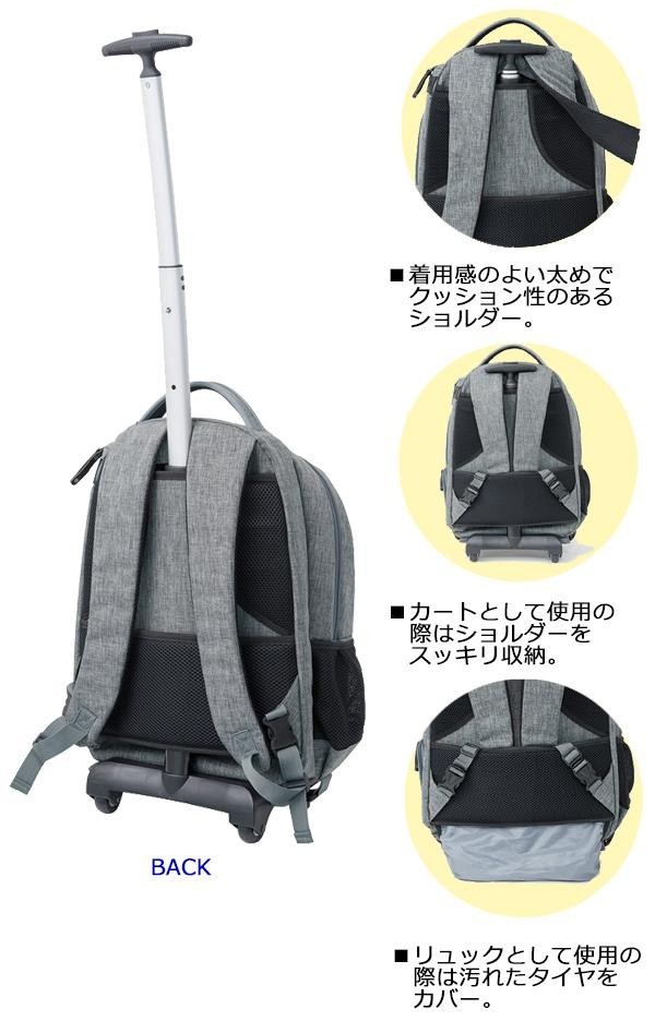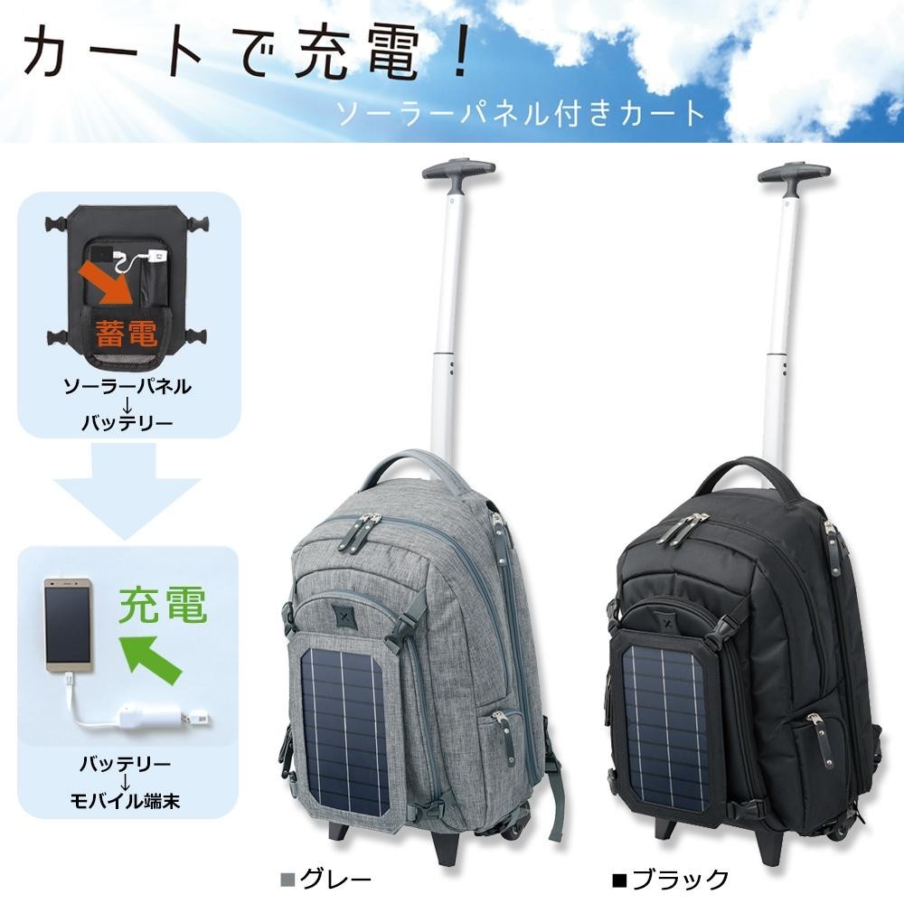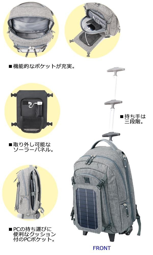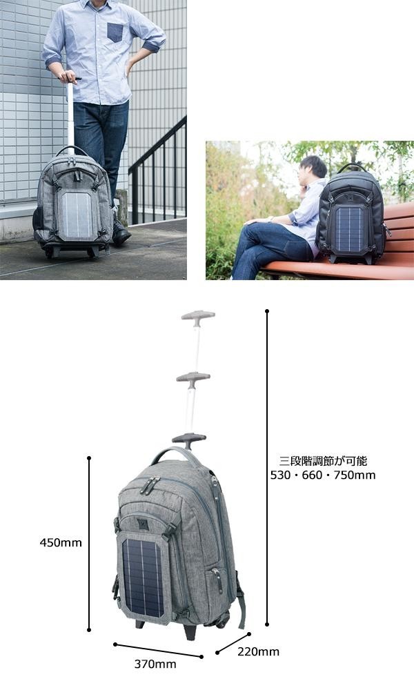 ソーラーパネル付きリュック型カート。シックで落ち着いた素材感です。PC用ポケットをはじめとした機能的なポケットを沢山搭載しました!!※付属のモバイルバッテリーは使用条件、保管条件を超える環境では、本体が著しく劣化し、故障に至る可能性があります。ご注意ください。 |
