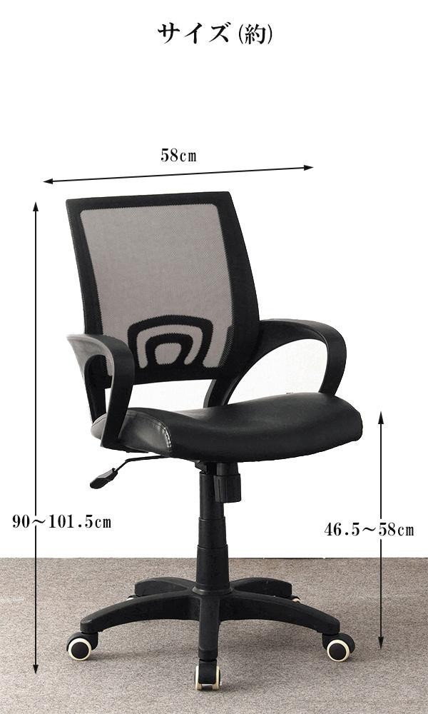 ガス圧式で座面の高さが調整できます。レバーを引くと、ロッキング可能。背もたれ部分は、通気性の良いメッシュを使用しています。 |