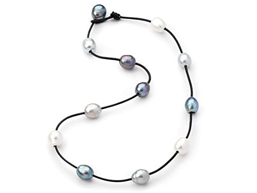 Freshwater Cultured Pearl Necklace Single Strand 11-12mm White Color with a Genuin Black Leather 18".