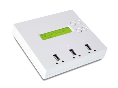 Portable microSD/SD flash memory duplicator SD300 copies from one source to two targets simultaneously. Simply power on, then press one button to start copying. Progress (percentage completed) can be monitored on screen. SD300 also comes with utilities to format and diagnose your SD/microSD cards. Compatible with SDHC. Lasts 4 hours copying or 10 hours standby when powered by AA batteries. Package includes SD300, power cord, user guide, and 3 microSD-to-fullsized-SD card adapters. Dimensions 1in X 5.25 in X 3.5 in