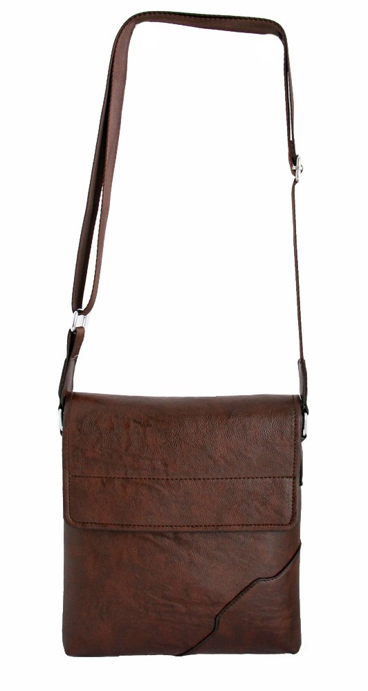 The adjustable shoulder strap length is a sturdy nylon material of similar color to leather.