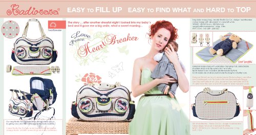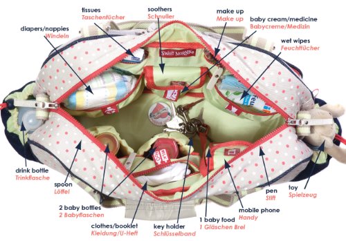 Studio : Sweet Morning Publisher : Sweet Morning Binding : Baby Product Product Description Colour: Beige with Allover Print in Coral/Off-White; Blue Denim / Material: 100% Cotton Canvas laminated inside; 100% Denim; 100% leather (bottom); Lining 100% Nylon water resistant, high quality YKK -Zipper, 4 Metal-Feet Description: With 22 inner and outer pockets, the diaper bag Radio Ga Ga offers enough space for various baby utensils. It is larger than standard nappy bags and thereforevery well suitable as a diaper bag for twins. The lining is water-resistant and the Outershell has a laminated inner layer, so that no liquid can leak in or out. Every mom will be delighted! 3 zippered compartments, 3 slide pockets with elastic band for diapers, baby wipes and medicine / cream, 2 insulated bottle warmer for baby bottles, 1 insulated glass warmer, 2 lockable compartments for cell phones and pacifiers eradicable Product Descritpion: 2 way zipper on top Outside front: 5 pockets: 2 zipper pockets with application, 2 small zipper pockets, 1 1Flap pocket with magnetic push button and embroidery, Outside back: 1 large zipper pocket Outside sides: 2 large denim pockets with cordel closer 2 straps (approx 54 cm), 1 detachable Shoulder strap (approx 90-145 cm) with karabiner hooks, 2 Clips/Hooks for the stroller (detachable with embroidery and karabiner) Inside: All pockets with ICON LABELS! - 3 zipper pockets, 3 elasticated slot pockets for diapers ..., 2 isolated bottle pockets for thin baby bottles (Ø 5,5 cm f.ex. Nuk Classic), 1 isolated bottle pocket for glasses, 2 lockable wishable pockets for dummy and mobile phone , 1 pen- and 1 spoon holder, 1 key holder strap with karabiner Set (4 pieces): bag with wishable changing mat (59 x 35 cm), detachable shoulder strap and Clip-System for the stroller/buggy Romy Rogotzki the german designer and founder of the new brand Sweet Morning proudly presents her new Mother´s bag "Radio Ga Ga". 0