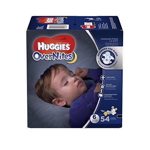 ReleaseDate : 2013-12-26 Studio : Huggies Publisher : Huggies Binding : Health and Beauty Product Description The most absorbent HUGGIES night time diapers, OverNites are designed for sleep, with Double Leak Guard for up to 12 hours of protection, a SnugFit waistband with Double Grip Strips for a secure fit, and a wetness indicator that changes color when it's time for a fresh diaper. Plus, these disposable night diapers have a quilted inner liner that locks away wetness and a breathable outer cover to help keep baby’s skin feeling dry and comfy. The #1 Selling Nighttime Diaper (based on nighttime diaper category sales), HUGGIES OverNites come in sizes 3 to 6 and fit babies and toddlers 16 to 35 pounds. 0