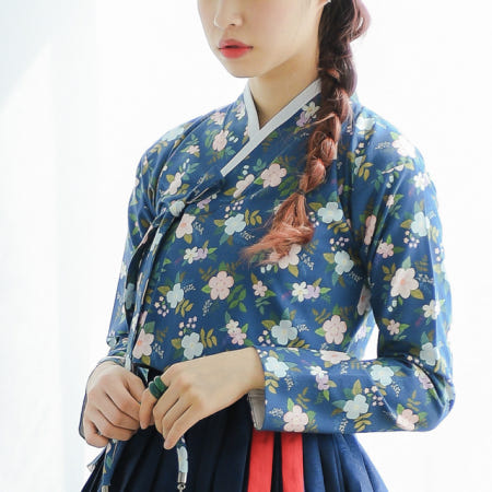 꿈속 꽃길을 걷듯, 네이비바탕에 하늘,분홍,보라 꽃송이들이 띄워져 있는 플라워패턴의 감성적인 저고리입니다.