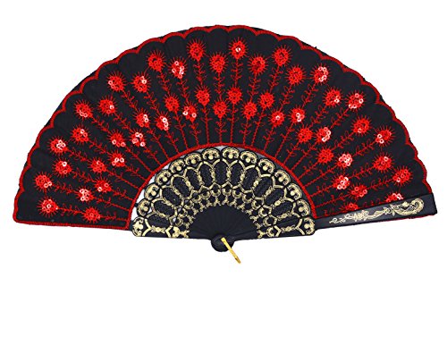 Amajiji Folding Fans for Women,Handmade Elegant Colorful Embroidered Flower Peacock Pattern Sequin Fabric Folding Fans (Red)