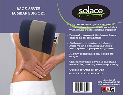 -. Binding : Health and Beauty -. Brand : Solace Comfort -. EAN : 0854531005917 -. Feature : All-day comfort - sitting at a desk or driving long distances can cause discomfort and pain / Proper posture and alignment - designed with true orthopedic support / Better foam shape retention - while memory foam might be good for pillows or bottom seat cushions / Multipurpose design - the best aspect of our car seat cushion is that is offers lumbar support alm / Removable, washable cover - each cushion features a removable covering that is machine safe -. Label : AKW Industries USA Inc -. Manufacturer : AKW Industries USA Inc -. Model : AKW-LS-006 -. MPN : AKW-LS-006 -. PackageQuantity : 1 -. PartNumber : AKW-LS-006 -. ProductGroup : Sports -. ProductTypeName : HEALTH_PERSONAL_CARE -. Publisher : AKW Industries USA Inc -. Studio : AKW Industries USA Inc -. Title : Solace Comfort Back Saver Lumbar Support -. UPC : 854531005917