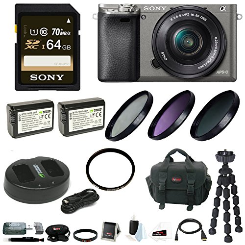 Includes: • Sony Alpha a6000 Mirrorless Digital Camera with 16-50mm Lens (ILCE6000LH) • Sony 64GB SD Card• 3 Piece Lens Filter Kit 40.5mm & 40.5mm UV Protector • Wasabi Power Battery 2-Pack and Dual Charger • 10" Spider Tripod • Focus DSLR Camera Bag Bundle