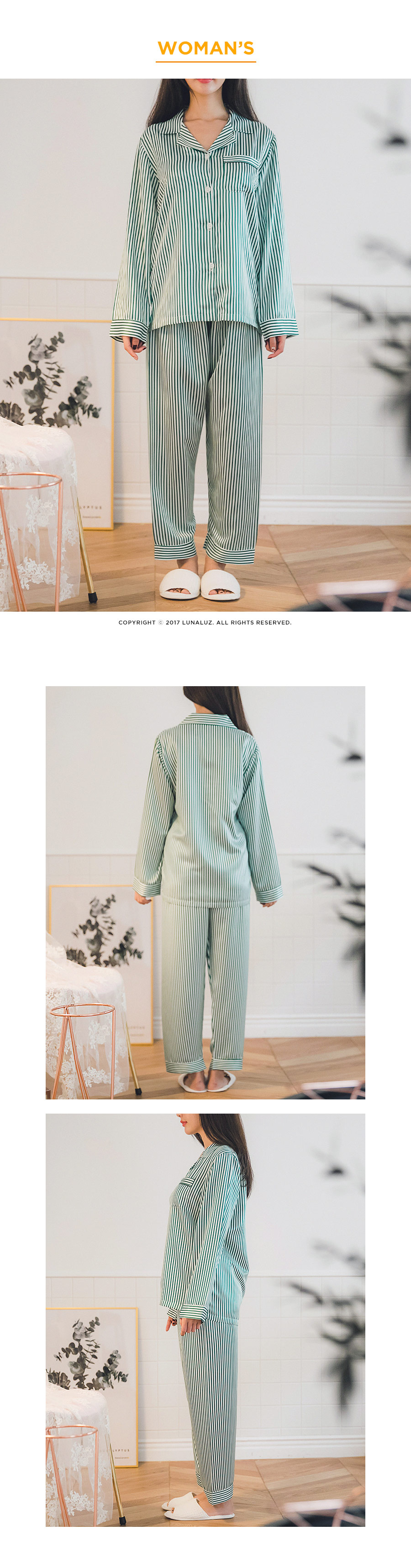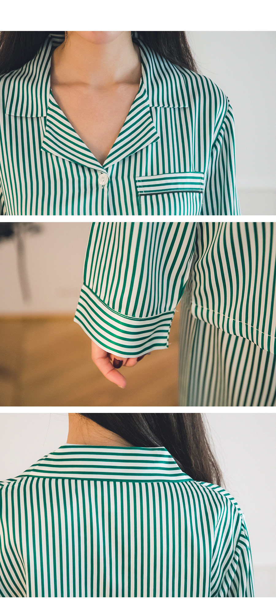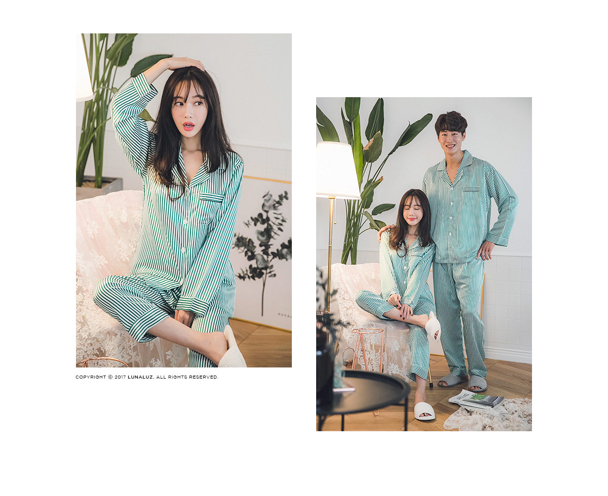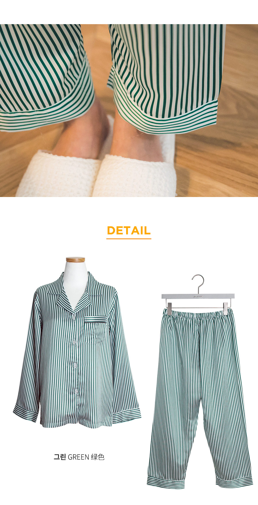 고급스러운 DTY소재와 사선 바이어스처리 된 스트라이프가 매력적이에요~! 네츄럴하고 드라이한 광택이 도는 샤무즈 소재에 스트라이프가 프린팅 되어 정말 고급스러워요~! 쨍한 광택이 도는 소재가 아닌 부드러운 광택이 도는 소재라 훨씬 세련되어 보입니다. 피부톤에 잘 맞는 그린 컬러를 직접 bt내어 작업한 원단으로 경쾌하고, 스타일리쉬하게 연출할 수 있습니다. 매끄러우면서 고급스러운 광택이 흐르는 소재와 시크한 디자인이 어우러진 프리미엄 잠옷이에요. 실키하게 떨어지는 부드러운 광택, 터칭감, 실루엣까지 완벽합니다. DTY 원사로 제작한 소재라 훨씬 더 고급스러우며 필링이 발생하지 않고, 타 원단에 비해 세탁과 내구성 면에서도 좋습니다. DETAIL깔끔한 포켓 카라 파자마셔츠 스타일로 스타일리쉬 해 보입니다. 소매의 끝단과 팬츠의 끝단에 바이어스 처리해 포인트를 주었습니다. 100% 국내 생산으로 봉제와 소재 마감이 깔끔하고 디자인의 퀄리티가 높습니다. SIZE평균 44반~66size까지 커버 가능한 free 사이즈 입니다.
