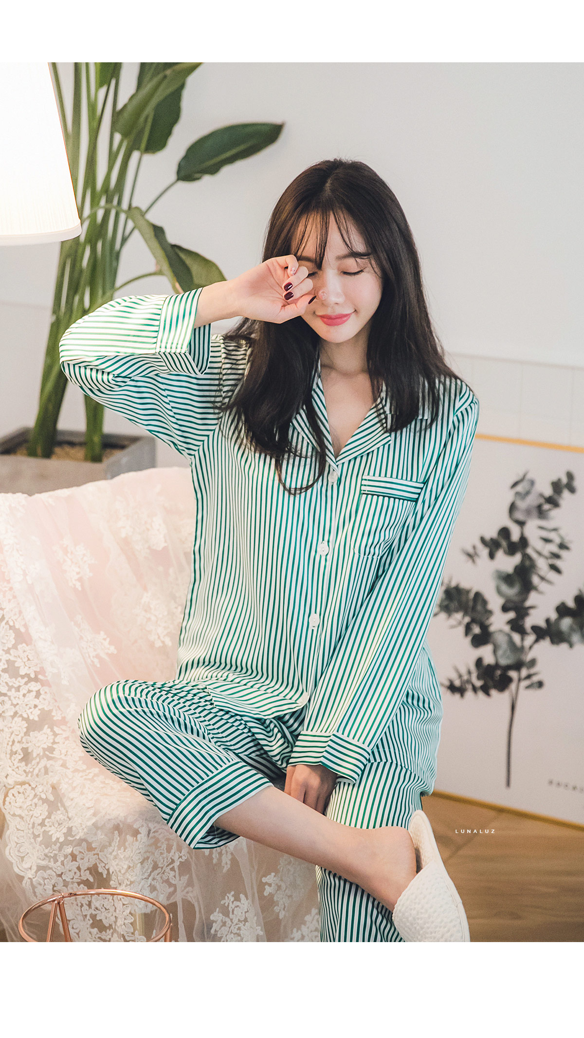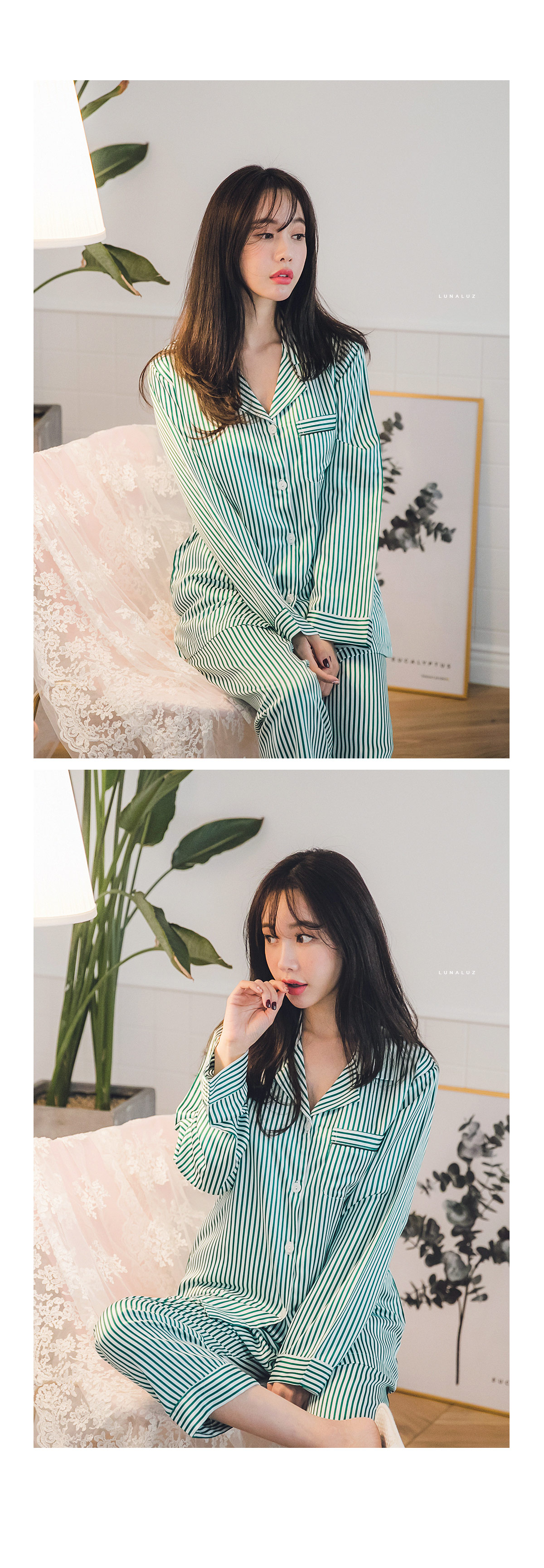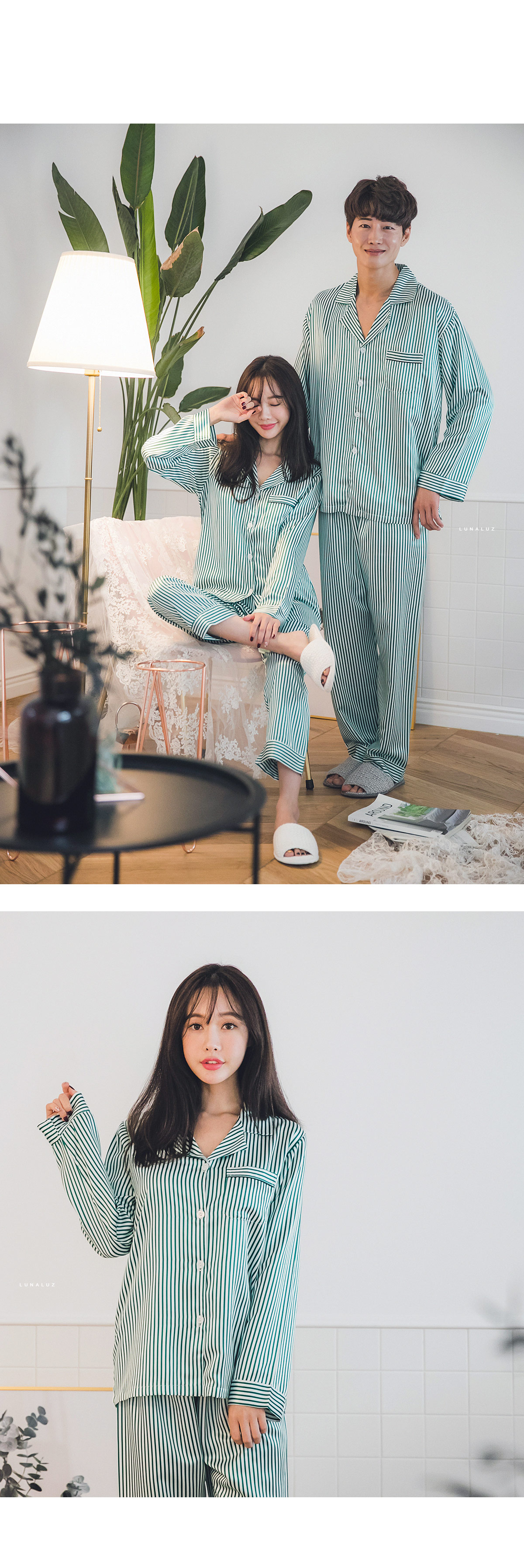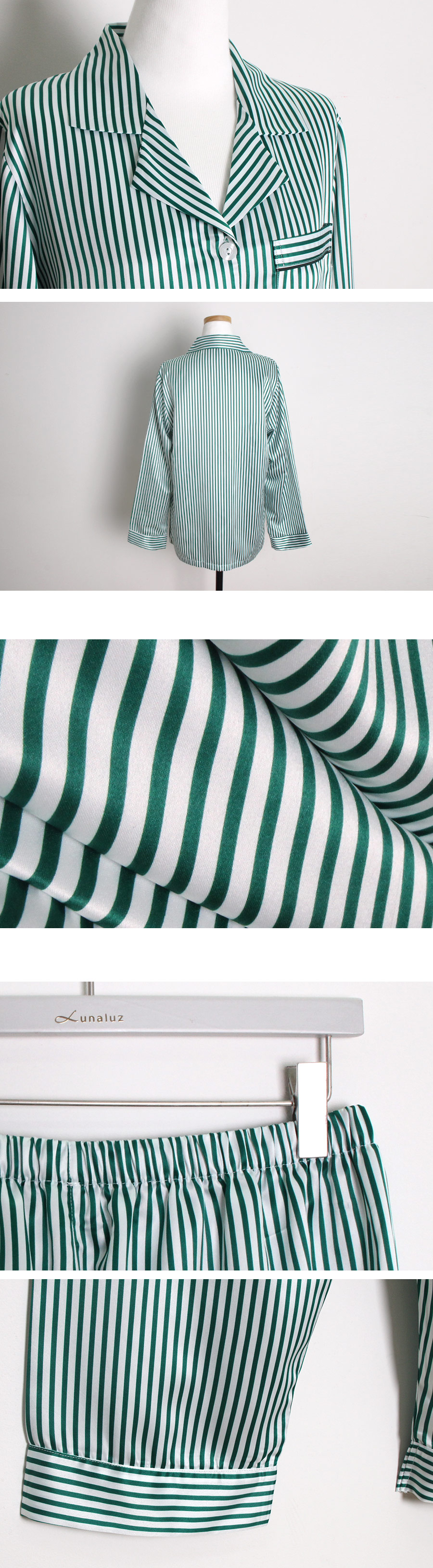 고급스러운 DTY소재와 사선 바이어스처리 된 스트라이프가 매력적이에요~! 네츄럴하고 드라이한 광택이 도는 샤무즈 소재에 스트라이프가 프린팅 되어 정말 고급스러워요~! 쨍한 광택이 도는 소재가 아닌 부드러운 광택이 도는 소재라 훨씬 세련되어 보입니다. 피부톤에 잘 맞는 그린 컬러를 직접 bt내어 작업한 원단으로 경쾌하고, 스타일리쉬하게 연출할 수 있습니다. 매끄러우면서 고급스러운 광택이 흐르는 소재와 시크한 디자인이 어우러진 프리미엄 잠옷이에요. 실키하게 떨어지는 부드러운 광택, 터칭감, 실루엣까지 완벽합니다. DTY 원사로 제작한 소재라 훨씬 더 고급스러우며 필링이 발생하지 않고, 타 원단에 비해 세탁과 내구성 면에서도 좋습니다. DETAIL깔끔한 포켓 카라 파자마셔츠 스타일로 스타일리쉬 해 보입니다. 소매의 끝단과 팬츠의 끝단에 바이어스 처리해 포인트를 주었습니다. 100% 국내 생산으로 봉제와 소재 마감이 깔끔하고 디자인의 퀄리티가 높습니다. SIZE평균 44반~66size까지 커버 가능한 free 사이즈 입니다.
