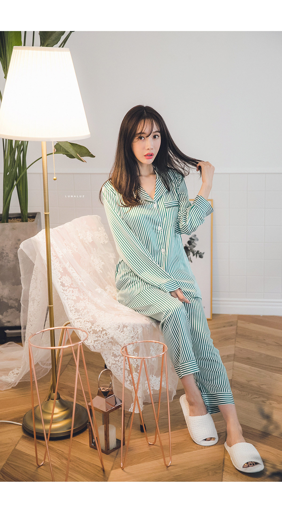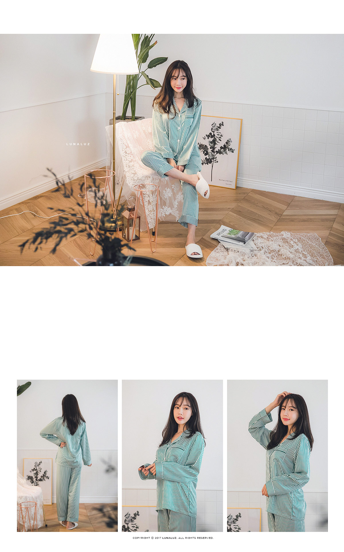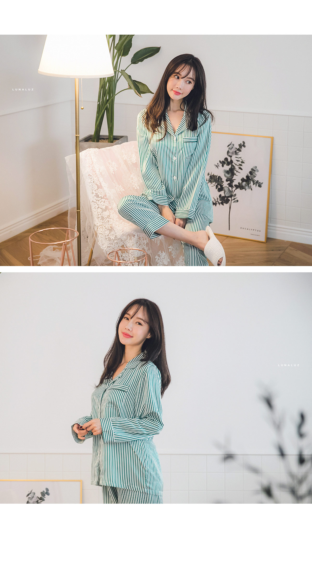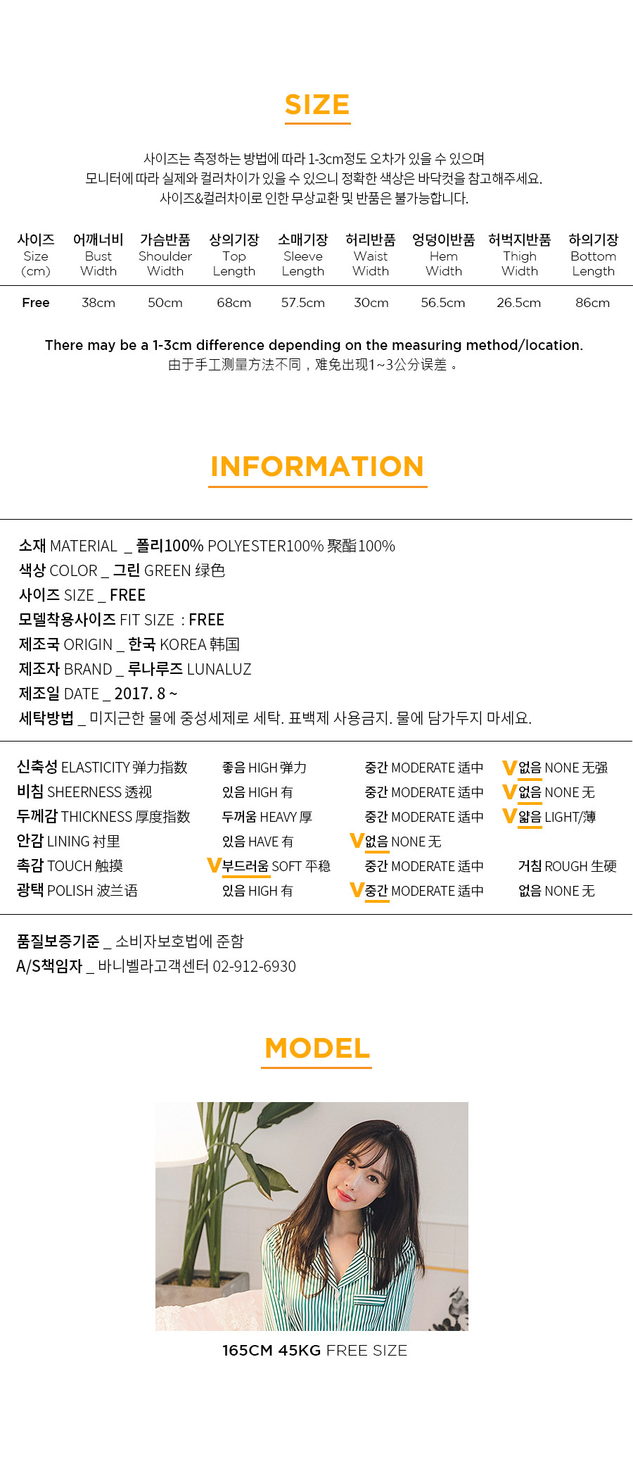 고급스러운 DTY소재와 사선 바이어스처리 된 스트라이프가 매력적이에요~! 네츄럴하고 드라이한 광택이 도는 샤무즈 소재에 스트라이프가 프린팅 되어 정말 고급스러워요~! 쨍한 광택이 도는 소재가 아닌 부드러운 광택이 도는 소재라 훨씬 세련되어 보입니다. 피부톤에 잘 맞는 그린 컬러를 직접 bt내어 작업한 원단으로 경쾌하고, 스타일리쉬하게 연출할 수 있습니다. 매끄러우면서 고급스러운 광택이 흐르는 소재와 시크한 디자인이 어우러진 프리미엄 잠옷이에요. 실키하게 떨어지는 부드러운 광택, 터칭감, 실루엣까지 완벽합니다. DTY 원사로 제작한 소재라 훨씬 더 고급스러우며 필링이 발생하지 않고, 타 원단에 비해 세탁과 내구성 면에서도 좋습니다. DETAIL깔끔한 포켓 카라 파자마셔츠 스타일로 스타일리쉬 해 보입니다. 소매의 끝단과 팬츠의 끝단에 바이어스 처리해 포인트를 주었습니다. 100% 국내 생산으로 봉제와 소재 마감이 깔끔하고 디자인의 퀄리티가 높습니다. SIZE평균 44반~66size까지 커버 가능한 free 사이즈 입니다.