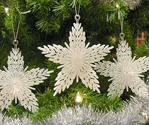 - Feature : GLITTER COVERED SNOWFLAKE ORNAMENTS. Set of 12 Acrylic snowflake ornaments. / SNOWFLAKE DECORATIONS. Beautiful acrylic snowflakes with glitter. Nice addition to your christmas tree ornaments. / WINTER DECORATIONS. Perfect to decorate a winter theme birthday party for girls. Hang from the Christmas tree, from the window or from the ceiling and doorways. Hang from different lengths for a more dramatic effect. / GLITTER SNOWFLAKES. / Each snowflake measures 5" Diameter. Order multiple sets of 12 for a more dramatic effect.
