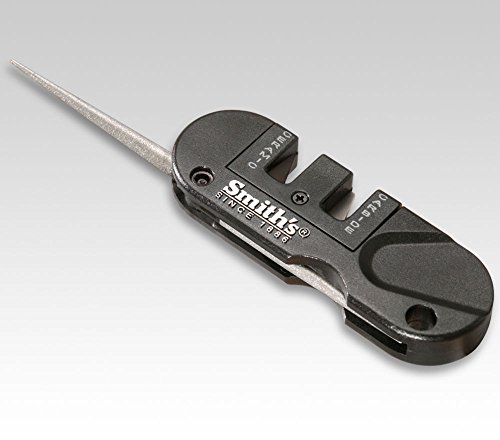 Smith's new "Pocket Pal" Multi-Functional Knife Sharpenerfeatures pre-set crossed carbides and ceramic stones, which provide the "Perfect Edge" every time. Carbides provide quick edge setting, and the specially shaped ceramic stones are designed to give you a razor sharp edge on either standard or serrated edges. The carbide and ceramic stones are reversible and replaceable. A fold out, tapered round, diamond coated rod is designed for sharpening serrated as well as standard edges. Unit is compact, lightweight, durable, and comes with a lanyard hole.