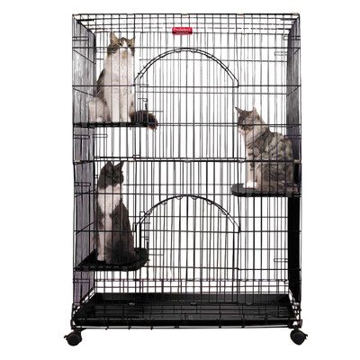 Studio : PetEdge Dealer Services* Publisher : PetEdge Dealer Services* Binding : Misc. Product Description Foldable cat cage is a roomy and secure place for cats and small animals to rest and play. Made of durable, powder coated 8 and 12 gauge wire with close 1-1/4-inch by 6-inch wire spacing for extra strength and rounded edges for safety. Available in black color. Includes two doors, three perches, a removable, easy-clean, color-coordinated ABS plastic pan and four locking casters. Remove cage from box. Lift up panels to unfold. Panels will form front, back and top of cage. Unfold and lift out one side panel and align it along front, back and top of cage. Unfold and lift out remaining side and secure to other side of front, back and top panels with clips. Attach perches at desired heights by hooking them to cage wires. Side with textured surface should face up. Slide ABS plastic tray into bottom of cage and hook latches to secure. Attach casters to bottom of cage using included screws. To open the hinged door at the bottom to remove tray, grip one of the corners, pull back and up to release the latch. Repeat on the other side. Lift up bar to take tray out. Measures 35-1/2-inch length by 22-1/4-inch width by 48-inch height. 0
