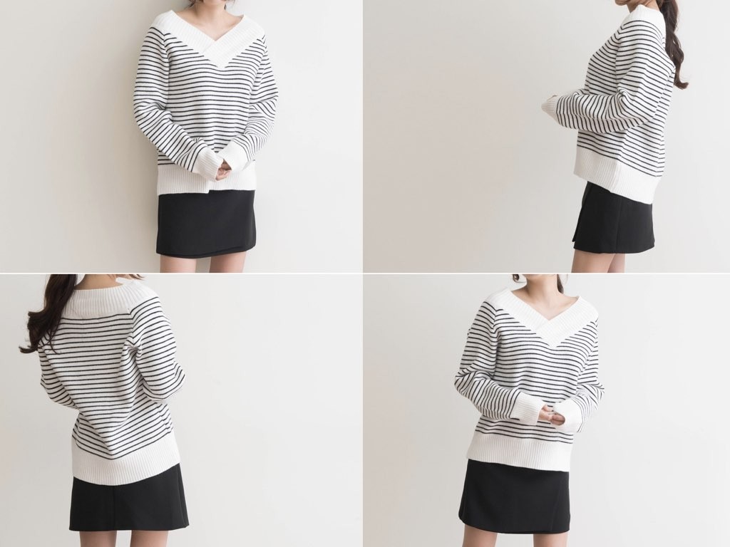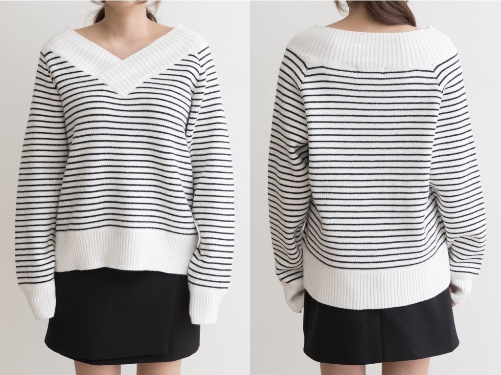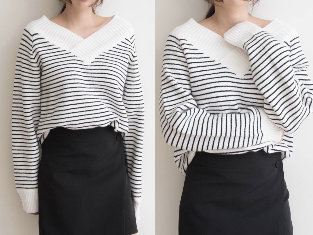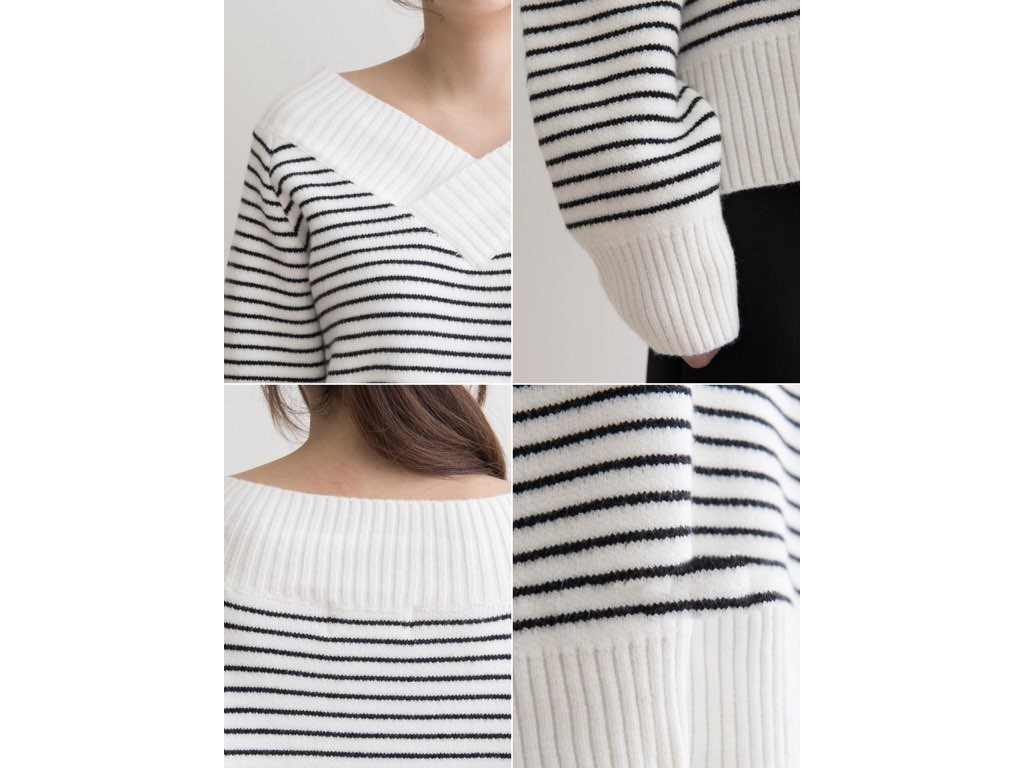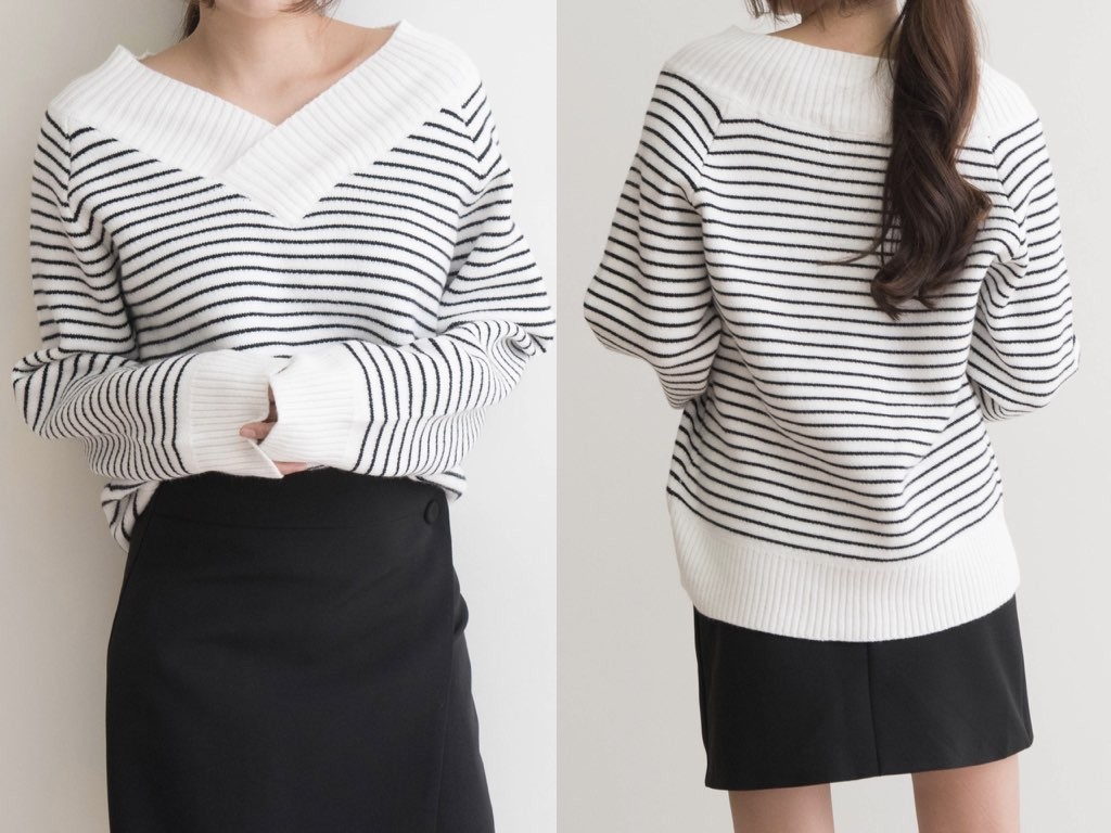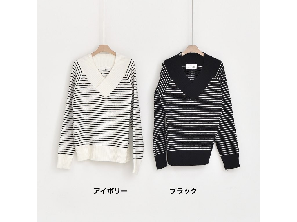 ボーダーのVネックです。アクリル混紡で、寒くなるこれからの季節にピッタリですね。シンプルながらも、デザイン性がありインナーとしても活躍◎1.基本情報色:2色展開(アイボリー/ブラック)サイズ:Free素材:アクリル混紡製造国:Korea2.サイズ情報肩幅:ナグランデザイン身幅(胸断面):53cm腕の長さ:67cm着丈(前):61cm(サイズは計る方法に応じて±2〜3cmの誤差があります。ご了承お願い致します)モデル着用サイズ:F※着用モデル(163cm、体重47kg、足のサイズ24.5cm)3.その他の情報厚み:中間透け感:なし伸縮性:あり裏地:なし洗濯方法:ドライ(クリーニング)[注意事項]お取り寄せ商品は、海外より仕入れるため納品まで約10日前後いただきます。また店舗でも販売しており、在庫切れになる場合もございます。ご了承お願い致します。