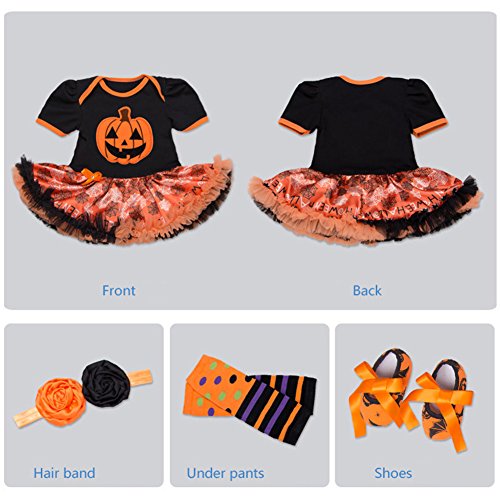 -. Brand : GP.R.Ince -. Department : unisex-baby -. Feature : Quality Material - Made from skin-friendly, soft, smooth and micro elasticity cotton weave. / Feature - Short sleeve, round neck dress with pumpkin and spider web pattern is cute dress-up. / Perfect Gift - Perfect Halloween/birthday gift for 0 months to 2 years old baby girl / Note - Because the computer or smartphone different can have the chromatic aberration, Please forgive! -. Model : US-lcl20170911-1-01 -. ProductGroup : Apparel -. ProductTypeName : BABY_COSTUME -. Title : 4Pcs Outfits Baby Girls Halloween Party Tutu Dress Headband Leg Warmers Flower Shoes