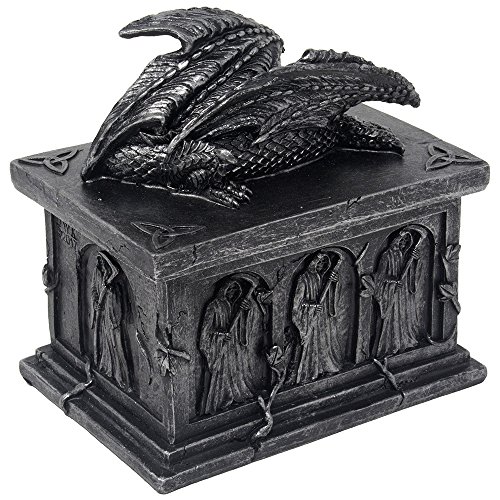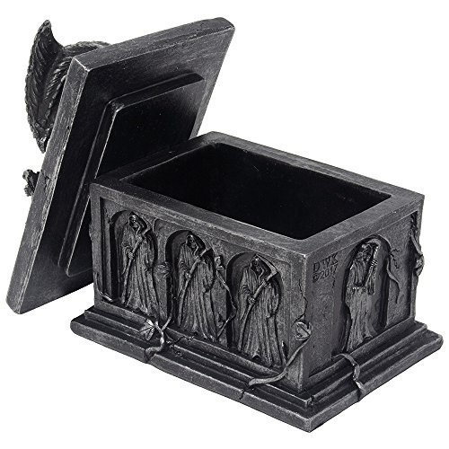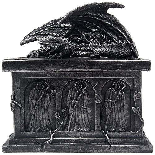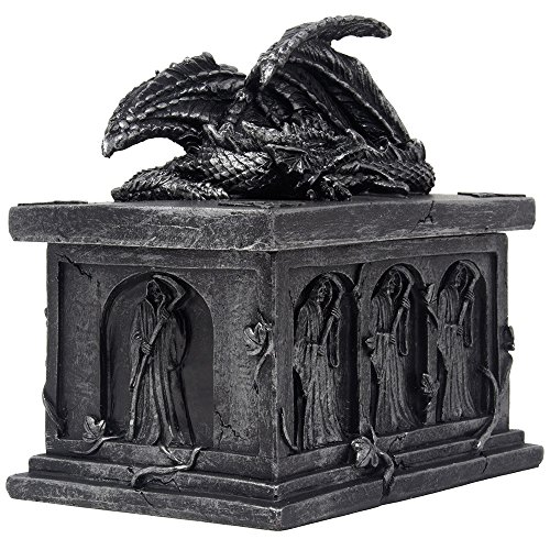 Mythical Guardian Dragon on Tomb Trinket Box in Metallic Look with Grim Reaper's Crypt and Hidden Storage Compartment for Decorative Gothic & Medieval Home Decor As Jewelry Boxes or Fantasy Gifts
