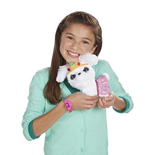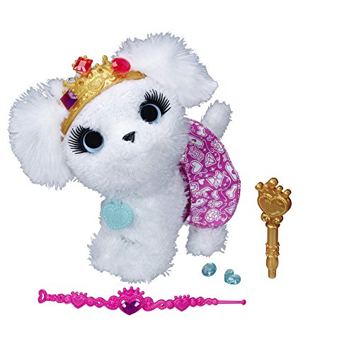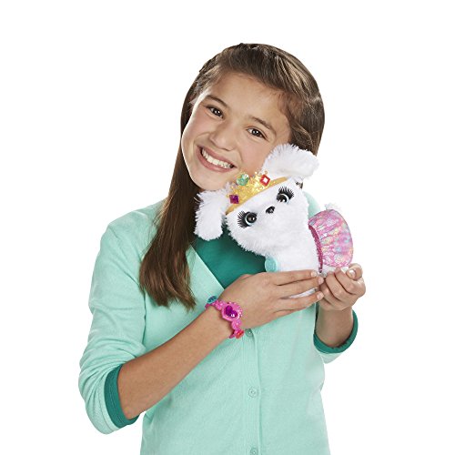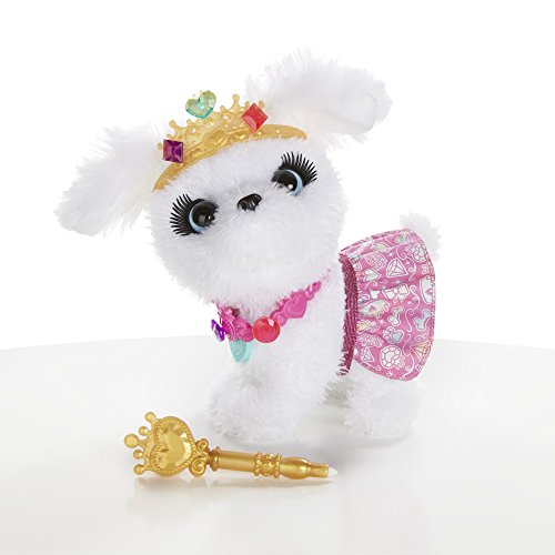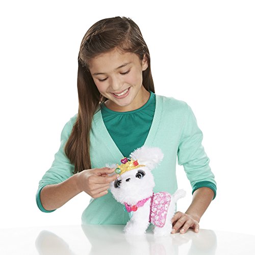 Win best in show when you groom your Princess Pup pet to perfection! This cuddly puppy figure's hair is super-soft and ready for styling, and she comes with a brush so you can make her look spiffy. You can give her one of 2 hairstyles, and then it's time to dress her up in her color-reveal dress. The water wand colors her beautiful dress even more, and then you can accessorize her look with the crown and plug-in jewels. Best of all, her collar is a bracelet you can wear! You and your Princess Pup pet will both look gorgeous when you go out together! FurReal Friends and all related characters are trademarks of Hasbro.Feature