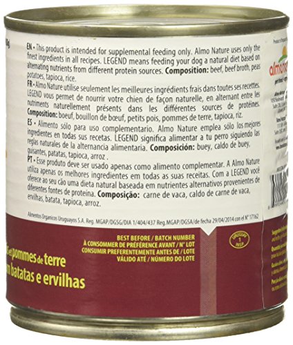 Legend Dog 280 g. /9.87 oz. Beef with Potatoes and Peas Home Made Style Ingredients: beef 35%, beef broth 33%, peas 15%, potatoes 14%, tapioca 2%, rice 1%. Guaranteed analysis: crude protein (min) 9%, crude fat (min) 3.5%, crude fibers (max) 1%, moisture (max) 81%, ash (max) 1%. 924 kcal/kg.Feature