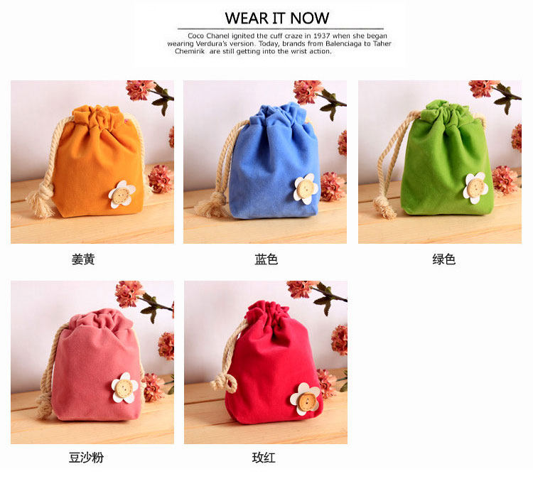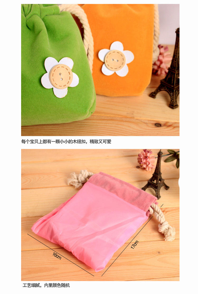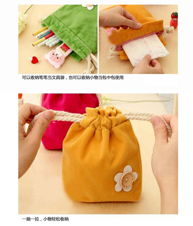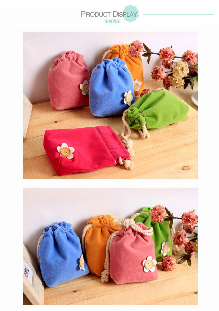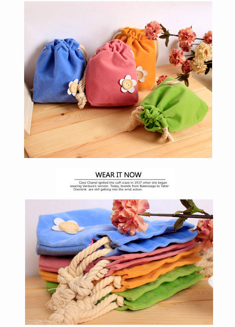 (买1送1)柔软双层糖果色绒布束口袋万用抽绳式杂物袋纽扣小花化妆包