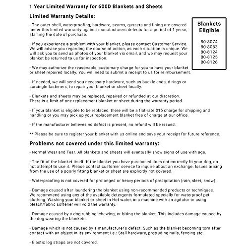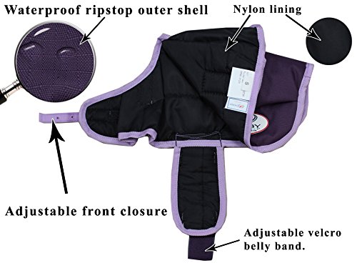 -. Binding : Misc. -. Brand : Derby Originals -. Feature : REFERENCE TO SIZE CHART ENCOURAGED - These blankets run larger than other brands. For the best fit please measure your pet and refer to the size chart before placing your order. Available in chocolate or purple / KEEP YOUR DOG WARM - Constructed with 150 grams of poly fill insulation that will dampen the harshness of miserable weather conditions from your dog. The 210 denier lining is breathable comfortable and durable / HEAVY DUTY MATERIAL DESIGN - These coats are made to endure what ever is thrown at them with a 1200 Denier Rip Stop Waterproof Outer Shell. Shoulder gussets extend the range of motion so your dog can run and play without restriction. The outer shell repels water and any excess debris can be easily wiped off without staining the coat / ADJUSTABLE CHEST BUCKLES BELLY BAND - Create a snug fit with adjustable chest buckles and an elastic belly wrap with a quick-grip closure. Refer to the size chart in the images to see the adjustability range / QUICK EASY ON/OFF - Designed to provide a hassle free experience. Modeled after the derby originals turnout horse blankets but tailored for your dog. -. Label : Derby Originals -. Manufacturer : Derby Originals -. PackageQuantity : 1 -. ProductGroup : Pet Products -. ProductTypeName : PET_SUPPLIES -. Publisher : Derby Originals -. Studio : Derby Originals -. Title : Derby Originals 1200D Waterproof Dog Blanket Coat with 150g Polyfill and 210T Lining- With 2 Year Warranty