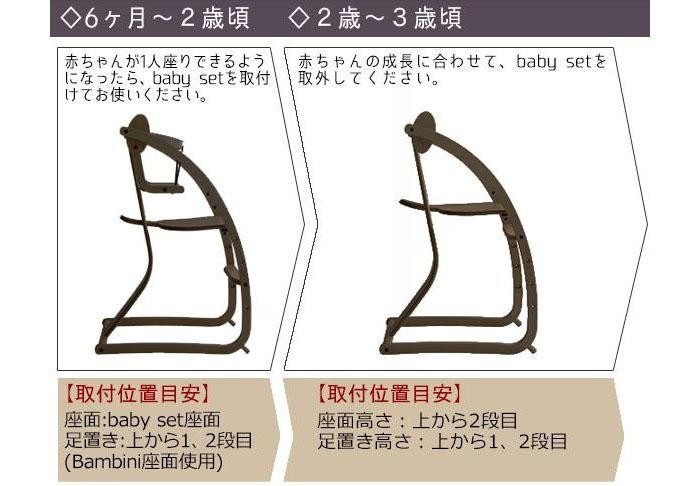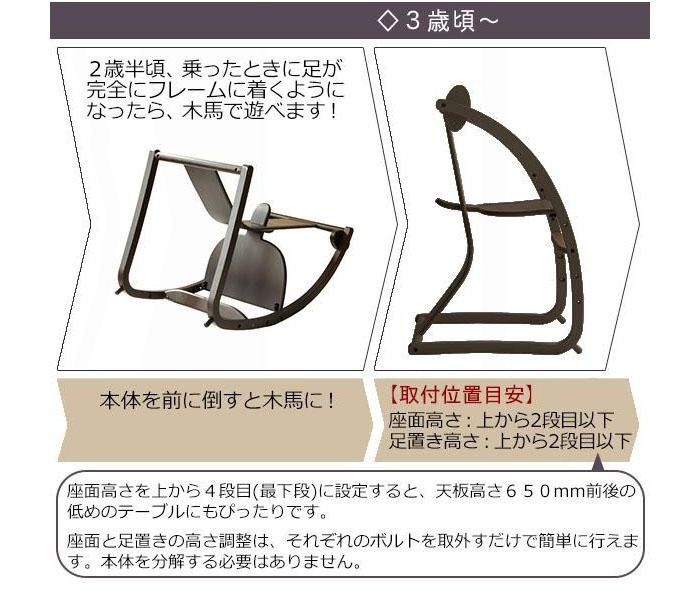 座面と足置きの高さを4段階に調整できるので、体の大きさやテーブルの高さに合わせて、子供から大人まで使うことができる椅子です。Bambini本体にbaby setを取り付ければ、赤ちゃんも安定した姿勢で座れる椅子になります。更に、本体を前に倒すと木馬として遊べます。 |