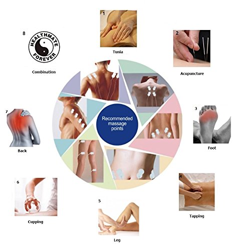 - Feature : HealthmateForever Electrotherapy Device: 8 preprogrammed massage modes in a flower design: Tuina (Push & Pull), Acupuncture, Foot, Tapping, Leg, Cupping, Back, Combination / Adjustable 10-60 minute timer, 20 levels of adjustable intensity/strength / Simultaneous dual output design, Allows 4 pads to be used at the same time / Rechargeable internal lithium battery - up to 10 hours of continuous use. Pause button / Easy to read animated Backlit LCD Display. The kit includes: 1 HealthmateForever NK8ML device, 4 piece self-adhesive conductive reusable gel pads, 2 sets of electrode wires, 1 USB Charger/Wall Unit, 1 Pads holder, Operating Manual, Acupuncture placement point chart, Lifetime Warranty Card, BONUS: Free Educational Reference Booklet
