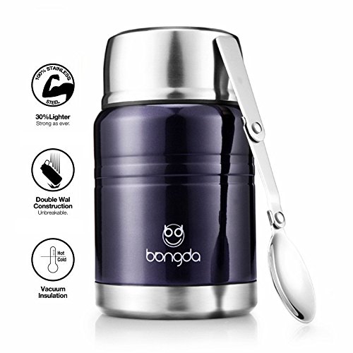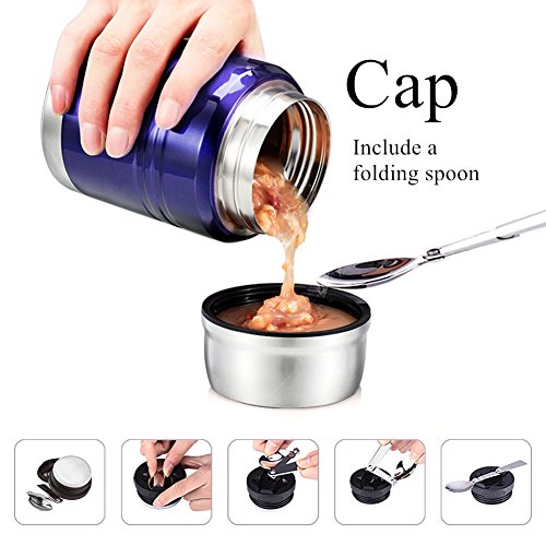 Vacuum Insulated Stainless Steel Food Jar with Folding Spoon, 16 Oz, - Perfect for Lunch On The Go (16oz, Blue)