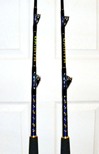 Genuine OKIAYA OFFSHORE Fishing Rod 100-120LB. Class Rod These are black blanks with royal blue and gold trim. All rods individually wrapped in a protective sock with our custom OKIAYA label. FIVE roller guides and 5'6" long for IGFA standup fishing Royal blue and black with gold trim Perfect for offshore trolling and fishing for Dolphin, Wahoo, and Tuna Featuring a classic design with use of CNC machined aircraft grade alloys for strength Composite fiber main shaft for superior sensitivity Super smooth rollers and durable hardware that keeps it looking good Sensitive tip to feel the bite and a real "bull dog" backbone for the fight of your life EVA foam grip and slick butt handle for fast and easy removal. Meets or exceeds all IGFA standards for all big game competitions Overall rod length 1.65M (5'6") OKIAYA rod cover included One piece heavy action Designed in the United States Four roller guides with a roller tip Premium grade fiberglass blank Anodized aluminum reel seat Cross-cut aluminum gimbal butt 100% satisfaction or your money back! 2 Year warranty against any defects! Customer service: 410-463-5326 Worldwide leader in offshore fishing tackle.Feature