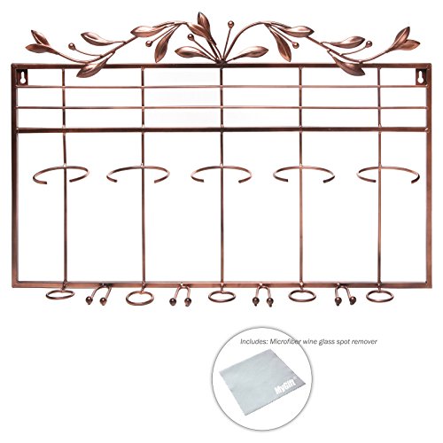 - Feature : A wall-mounted wine bottle rack with an elegant olive branch motif. / Features space for 5 wine bottles (max diameter of 3.2") and 4 wine glasses (max base diameter of 2.5"). / Holds wine bottles upside down to keep corks wet and prevent flavor-killing oxidation. / Please use proper mounting hardware (wall anchors, studs, brackets, etc.). Comes with multipurpose cleaning cloth. Wine bottles not included. / Approximate Dimensions: 26" L X 3.5" D X 18" H.