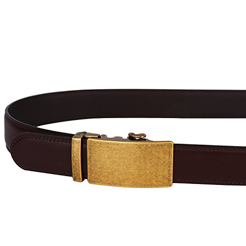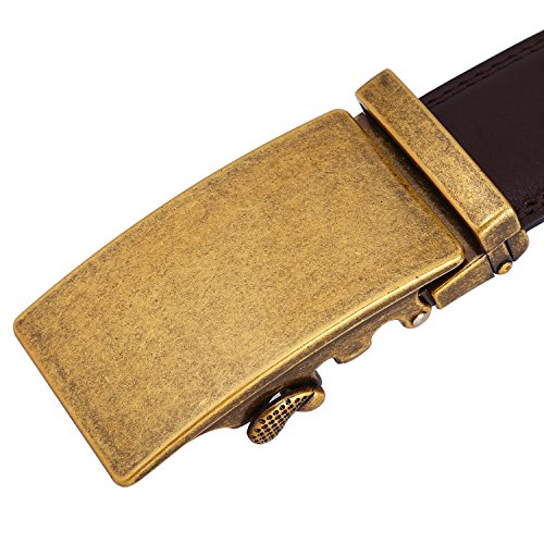 MAXIMUM DURABILITY - Leather strap is a bit wider than 1 2/5" presenting the perfect look of a fine, genuine leather quality belt, complemented with an HIGHLY FASHIONABLE stylish, buckle that is elegantly designed with class. Scratch resistant buckles made to last.