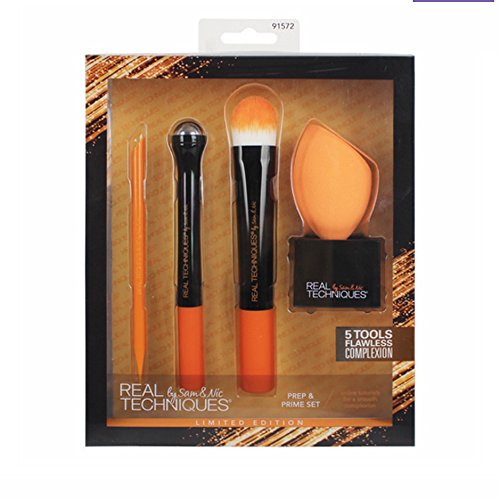 5 TOOLS. FLAWLESS COMPLEXION.limited edition prep + prime set has every tool you need to prep, prime, and apply foundation.beauty spatula: flexible slanted tips retrieve moisturizers or creams from jars to make the most of your product.under eye reviver: stationary aluminum ball for cooling under eye massage. tip: use with favorite under eye cream.prep brush: firm brush head to evenly apply primers, moisturizers, serums, and/or masks.miracle complexion sponge: shaped to create the perfect base and build coverage using liquid foundation. tip: use damp for a dewy glow or dry for a full coverage.sponge stand: perfectly size for sponge storage and drying.