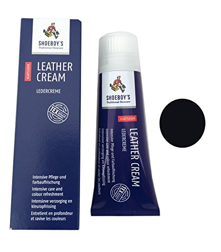 -. Feature : Shoeboy's leather cream revives & refreshes the color, conceals scratches and scuffed leather, while waterproofing and leaving your leather with a shine. Solvent-free. / High-quality leather dye polish smooth leather renovator. Intensive conditioning, renovates the leather's color and provides effective protection against moisture. Leaves leather clean and re-freshened without leaving a greasy or tacky residue. / For the best results we recommend first cleaning off excess dirt from the item. Then use the Shoeboy's Multi Clean to clean off any deep set stain. Then waterproof your item using the Shoeboy's Water Protect Foam. Finish off with a Shoeboy's Horsehair Polishing Brush for a professional looking shine. To condition your leather, use the Shoeboy's Leather Balm, and buff onto the shoe using the Shoeboy's Polish Cloth . / 75 ml tube with sponge applicator. Color: Black. Directions: Gently press the sponge applicator onto the shoe, handbag or clothing. Apply evenly leave to dry. / Made in Germany. Sold at premium high end designer stores. Money-back satisfaction guarantee.