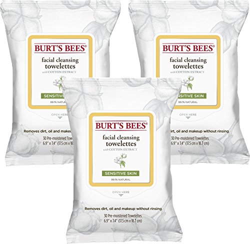 Burt's Bees Sensitive Facial Cleansing Towelettes with Cotton Extract for Sensitive Skin, 3 Packs of 30 Towelettes, 90 Towelettes Total