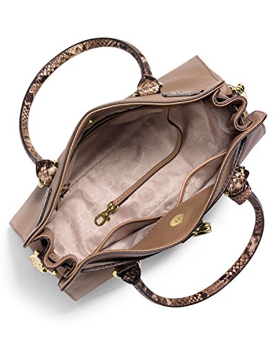 -. Brand : -. Color : brown -. Department : womens -. Feature : 12-3/4" W x 9" H x 5-1/2" D / Magnetic closure / Interior features 1 zip pocket, 2 open pockets, 1 cellphone pocket and key fob / Exterior features gold- or silver-tone hardware and signature lock & key charms / Double handles with 4" drop; shoulder strap -. Model : 30T5GHMS3E -. ProductGroup : Shoes -. ProductTypeName : HANDBAG -. Title : Hamilton East West Satchel - Dark Khaki & Snake Embossed