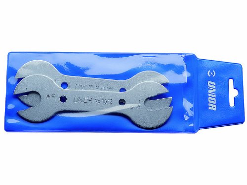 Studio : Unior Publisher : Unior Binding : Misc. Product Description From the makers of tools that will last for generations, the Unior Cone Wrench Set is made from hardened and tempered steel that's been chrome-plated. Handles are non-rubberized. The set is two double-open-ended wrenches that come in a plastic pouch. Wrench heads include 13mm, 14mm, 15mm, and a dual 16/17mm staggered opening. 0