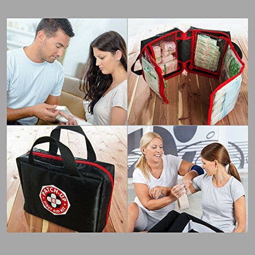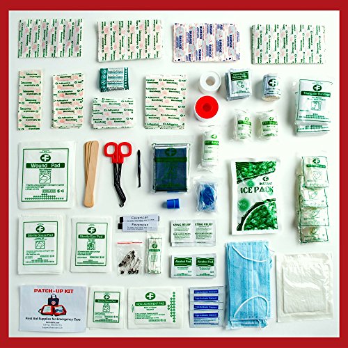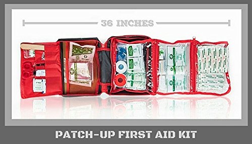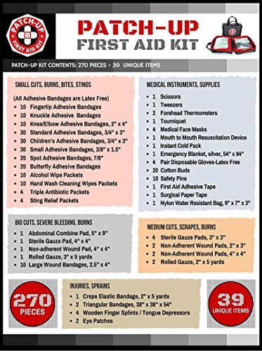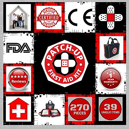 First Aid Kit From Patch-Up (39 unique medical items totaling 270 pieces) Designed For Family Emergency Medical Care and Survival. Compact-Water and Stain Resistant-Nylon Bag Is Ideal For Home-Car-Boat-Sports-Hiking-Camping-Outdoors. Protect Your Loved Ones With a Patch-Up Kit. This premium, well-organized, lightweight, Patch-Up Kit contains all the necessary medical supplies to provide emergency care and survival treatment for a family (or any group} of 4-8 people. HOSPITAL GRADE MEDICAL SUPPLIES All 270 pieces are manufactured in an FDA and CE approved facility. The Patch-Up Kit provides a unique combination of first aid medical and emergency preparedness supplies that could help to save the lives of those close to you. WELL-ORGANIZED COMPACT BAG This compact kit (9"x 7"x 3") has zippered see-through pockets which fold out to 36" for easy access to all the 270 medical supplies. This tough, lightweight portable bag can easily fit in a suitcase or backpack to be taken with you so you can be prepared for emergencies wherever you go. Kit instructions plus First Aid Guide are inlcluded. ONE-YEAR MONEY BACK GUARANTEE The Manufacturer of Patch-Up First Aid Kits, Patch-Up Products, offers a complete ONE-YEAR MONEY BACK GUARANTEE. If you are not completely satisfied with the quality of your kit and its' contents, or if your kit gets damaged in shipping, your kit will be replaced and/or you will be given your money back.Feature
