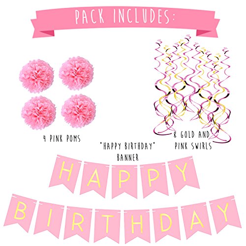 -. Feature : Congratulations! You are a year older!!!! What better way to celebrate than with our hand strung, premium quality happy birthday banner, pom and swirl pack. This pack is the perfect decoration to add a touch of classy decor and welcome your guests to the occasion. Whether for your kids 1st birthday in the park or dad's geriatric boogaloo in the home.... these birthday party decorations are perfect for any age! / PACK: Pack includes 1 Banner, 4 pink tissue paper poms and 8 gold and pink shiny swirls. / QUALITY: The beautiful, high quality gold foil P.R.Inted letters will catch the attention of your loved ones when they shimmer in the light. Our happy birthday sign is meant to be reused. / SIZE: Happy measures 3 feet. Birthday measures 5 feet. The letters are P.R.Inted on each 8 x 6 inch pink cardstock flags then hand-strung with plenty of extra ribbon for easy hanging. / GUARANTEE: We stand by our banners with a 100% money back guarantee. If this happy birthday banner does not make you and your loved one's smile, then your money back.