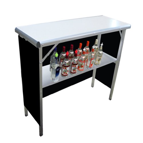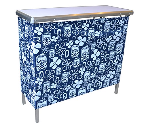 - Feature : Portable high-top party bar with 3 interchangeable skirts / Ideal for parties, tailgaters, trade shows, and more / Professional top with waterproof MDF surface / Hidden storage shelf in back; includes carrying case / Measures 39 x 36 x 15 inches (W x H x D) when open / Includes 3 Interchangable Skirts: Tiki, Football and Formal / Ultra Lightweight - Only 12 Pounds! / Sturdy Aluminum Frame and Waterproof Surface / Front Bar Skirt easily velcros on and off / Hidden secondary storage shelf