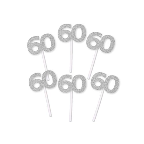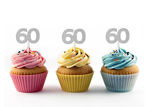 60th Birthday Cupcake toppers in Silver Glitter (20 count)
