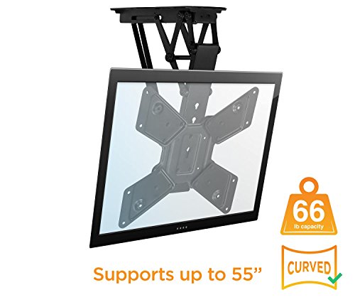 -. Feature : ELECTRIC FOLD DOWN ROOF MOUNT - Flip your TV down and up with motorized remote control ceiling mount. Clear up space in your room and store your TV out of the way. / VESA COMPATIBLE - Works with all TVs with standard VESA patterns of 200x200mm, 400x200mm, 300x300mm, or 400x400mm. Fits from 23 inch monitors to 55 inch TVs. / POWERFUL MOTOR WITH REMOTE CONTROL - Rated for 66 Lbs of weight, the motor will drop down the TV and will lift it up flat on the ceiling with ease. / EASY ASSEMBLY - Installs in minutes. Comes with power cord and adapter. Ideal for slanted/pitched roofs with 0 to 75 degree tilt. Program function with preset position for ease of use and positioning at the ideal angle. / STURDY CONSTRUCTION - Contsructed from high-strength steel and is tested to 3 times the rated weight load of 66 lbs.