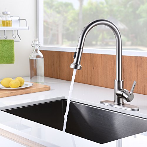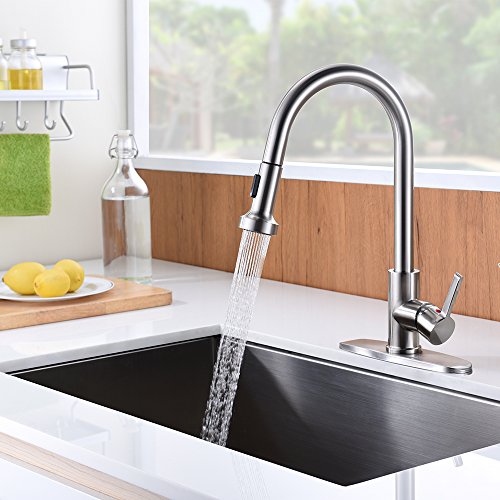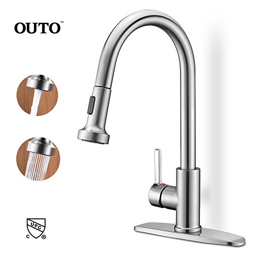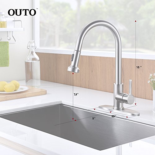 Kitchen Sink Faucet, OUTO Upgraded Stainless Steel Single Handle Pull Down Sprayer Kitchen Faucet with Deck Plate, Stream and Spray Two Mode, Pull Out Kitchen Faucets Brushed Nickel cUPC certificated