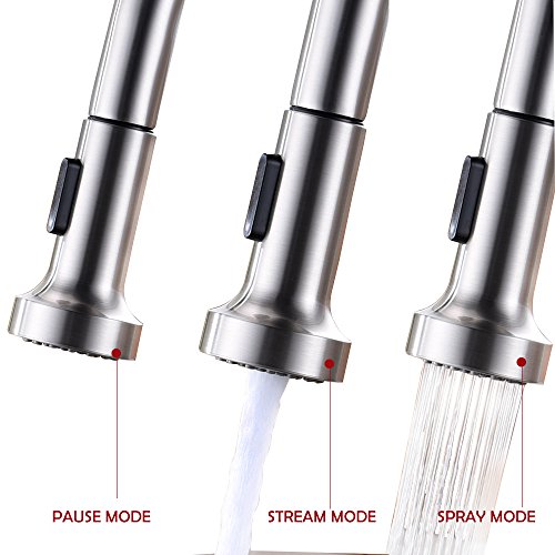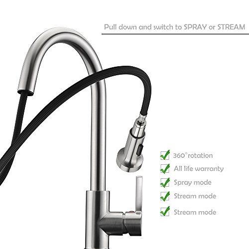 ※ STREAM & SPRAY TWO MODE - High arc stream and spray reduce splashing. Easy undocking and minimal pull out / pull down resistance. Ergonomis spray wand is easy to use & extend. The spray wand effortlessly returns on its own to its orginal dockd postion. Easy to change spray setting with the touch of button, 360 degree rotate