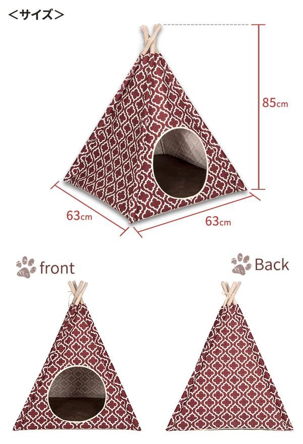 | テントで囲われた空間は犬猫のリラックス空間に。テント部分にはベッドで使用する生地を使用し、居住性を高めるための専用マットも用意しました。先住民族のティピーがそうだったように、プレイ・ティピーテントも組立・片付けがとても簡単!!持ち運びも便利です。大きめのティピーテントですので、体重5kg程度の犬猫であれば2匹同時に入れます。ご家庭でのお洗濯も可能ですので、清潔に長くご愛用いただけます。 |