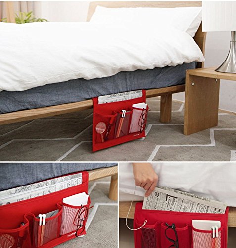- Application: bedside, sofa, desk, chair, mattress, table,etc. Neatly stores your remote TV control, flashlights, medications, cellphone, TV guide, A4 magazines, notebooks, pens, glasses, snacks, and earphones