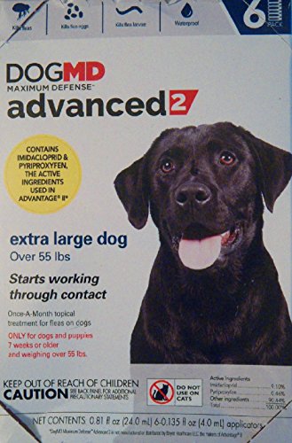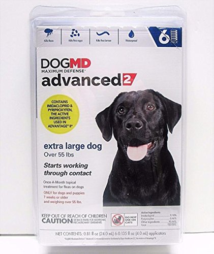 Studio : Meridan Animal Health Publisher : Meridan Animal Health Binding : Misc. Product Description DogMD Maximum Defense Advanced II for Extra Large Dogs is used monthly, and kills fleas within 12 hours of application. You can expect this highly effective product to last up to 4 weeks, and to kill reinfestations within 2 hours. It is also waterproof, and remains effective even after bathing, swimming, or exposure to sunlight or rain. Features: Kills fleas within 12 hours and reinfesting fleas within 2 hours lasts for up to 2 weeks Waterproof Intended For: Dogs and puppies 7 weeks or older and weighing over 55 lb Includes: Either 4 or 6 applicators Health Consideration: Flea Tick Pet Weight: Large Dog Total Weight: 4 Count: 0.54 fl oz (16.0 mL) 6 Count: 0.81 fl oz (24.0 mL) 0