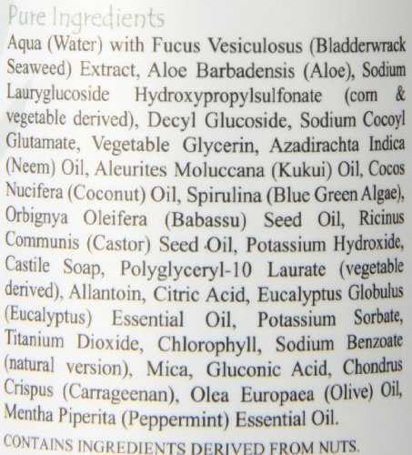 -. Feature : Calming + cleansing: moisturizing lather leaves skin feeling refreshed and renewed / #1 ingredient is nutrient-rich seaweed extract in purified water / Natural ingredients include antioxidant-rich blue green algae, antimicrobial neem oil / Detoxifies, hydrates and replenishes all skin types including dry, cracked skin / Invigorating eucalyptus & peppermint scent is from a natural, pure essential oil blend